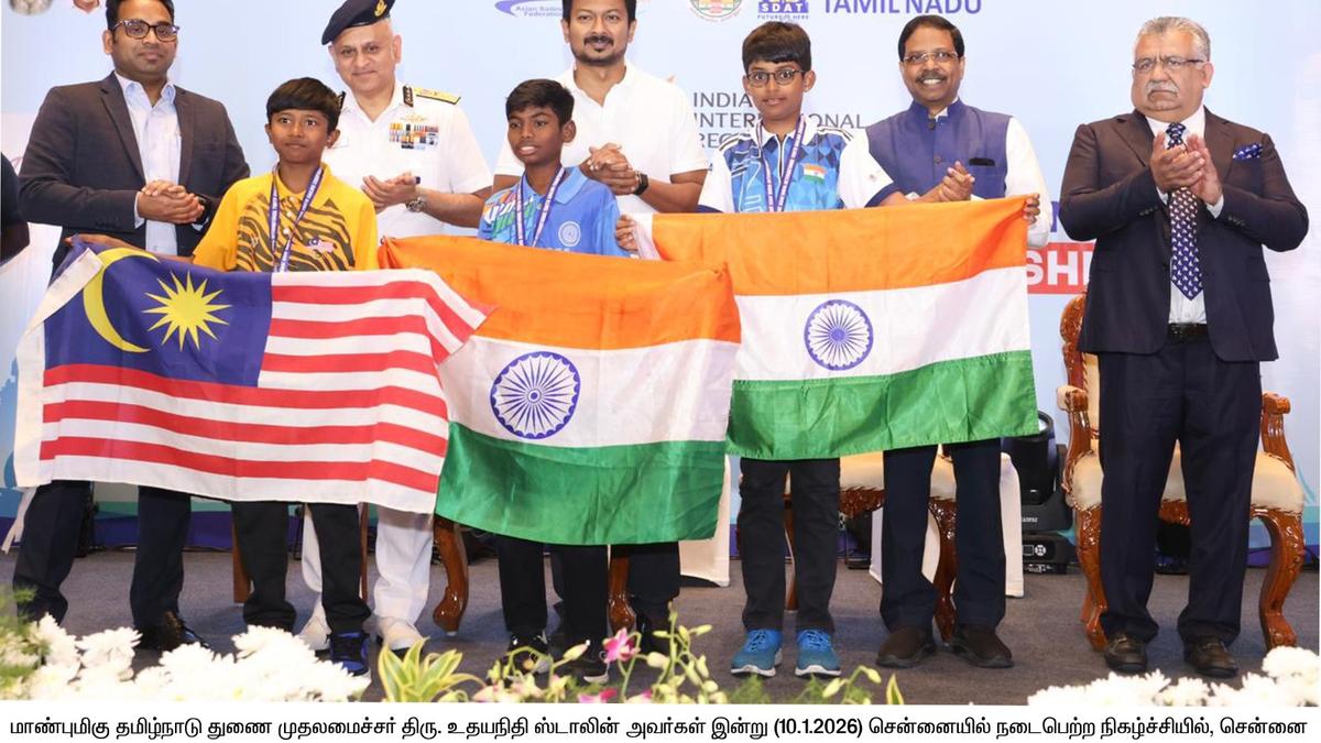 उपमुख्यमंत्री उदयनिधि स्टालिन ने शनिवार को इंडिया इंटरनेशनल यूथ सेलिंग चैंपियनशिप 2026 के विजेताओं को सम्मानित किया। तमिलनाडु के खेल विकास प्राधिकरण ने 6 से 9 जनवरी तक चेन्नई बंदरगाह पर प्रतियोगिता का आयोजन किया। 12 से 18 वर्ष की आयु के आठ देशों के कुल 87 नाविकों ने प्रतियोगिता में भाग लिया। इनमें से भारत का प्रतिनिधित्व करने वाले 27 नाविक तमिलनाडु से थे। भारतीय टीम छह स्वर्ण, तीन रजत और तीन कांस्य सहित 12 पदकों के साथ पदक तालिका में शीर्ष पर रही। श्री उदयनिधि ने चेन्नई में आयोजित एक समारोह में विजेताओं को सम्मानित किया।