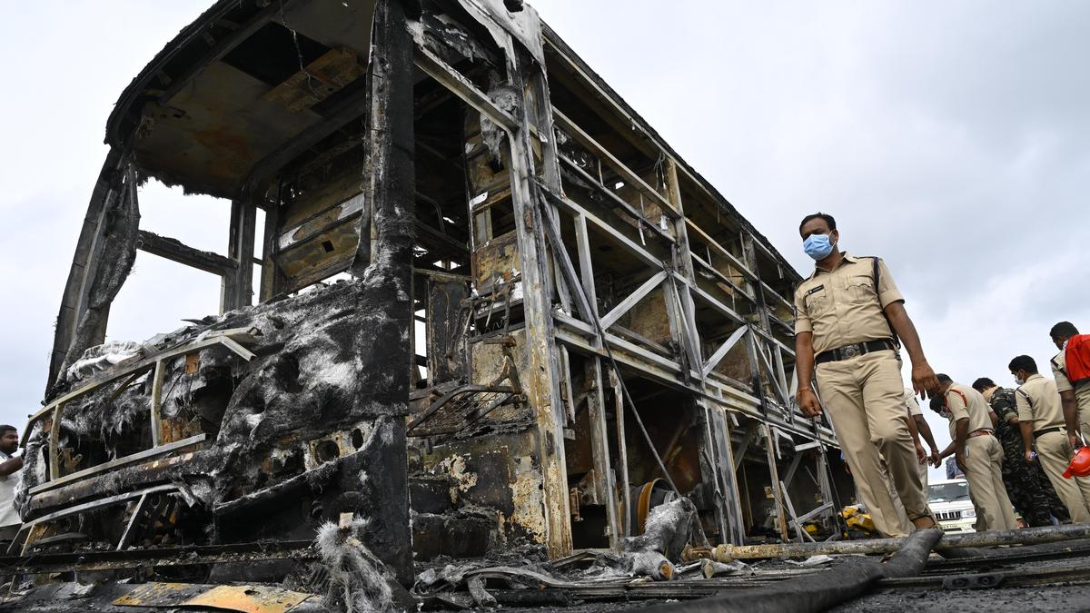 24 अक्टूबर की तड़के कुरनूल जिले के चिन्ना तेकुरु गांव में उस निजी बस के कंकाल के अवशेष, जो आग की चपेट में आ गई और 20 लोगों की जान चली गई। फोटो साभार: फाइल फोटो