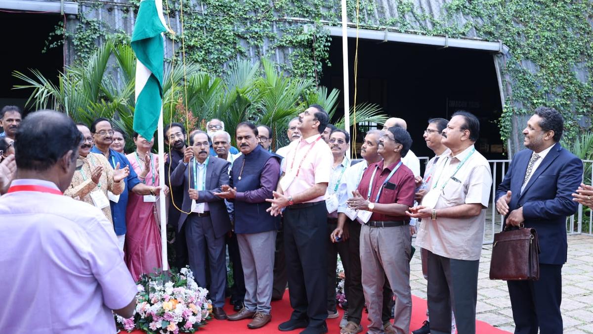 केए श्रीविलासन, आईएमए राज्य अध्यक्ष, 8 नवंबर को कोझिकोड में आईएमए राज्य सम्मेलन के उद्घाटन के अवसर पर राष्ट्रीय ध्वज फहराते हुए। फोटो साभार: विशेष व्यवस्था