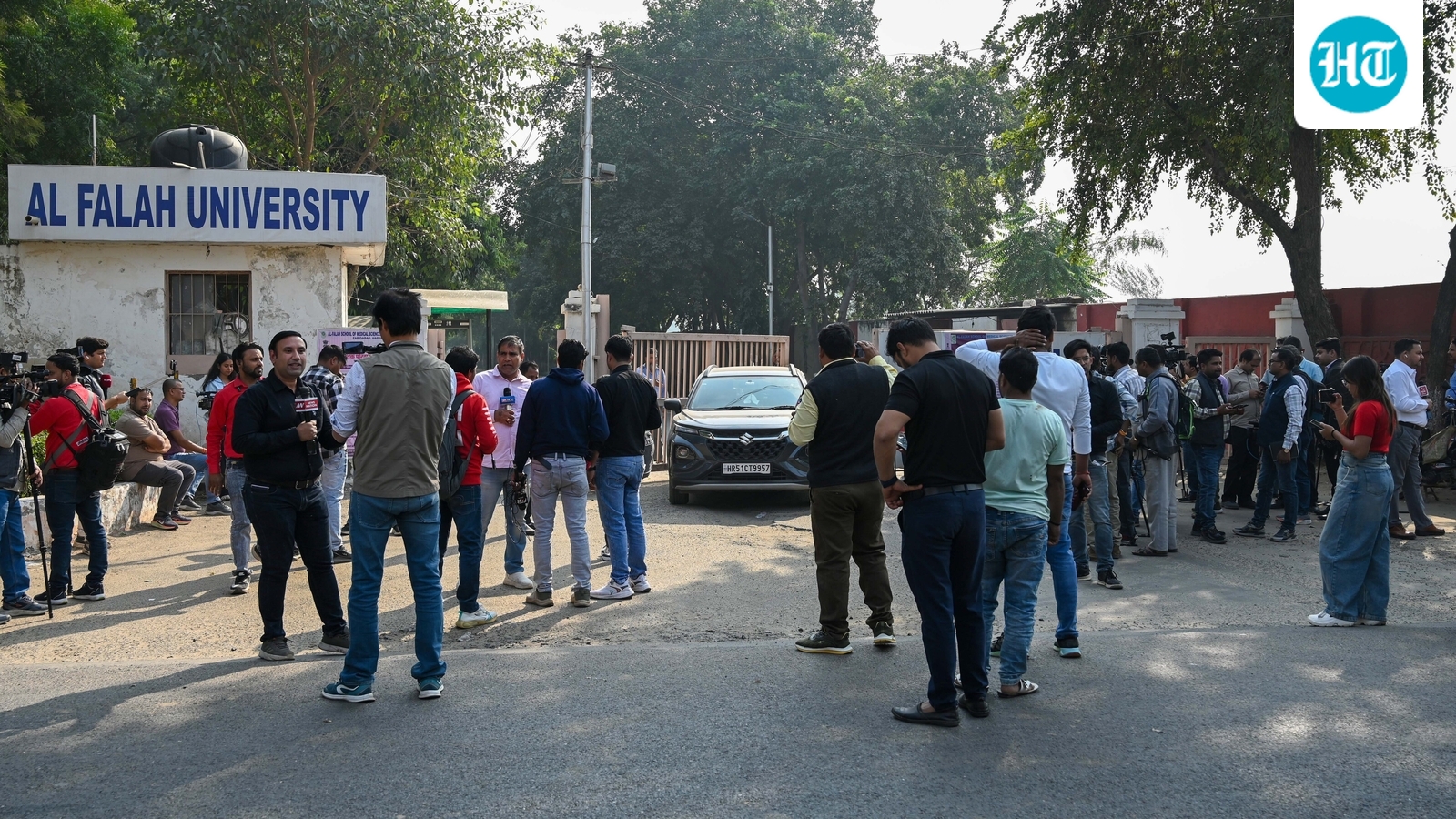 फ़रीदाबाद: फ़रीदाबाद में धौज रोड पर स्थित अल फलाह विश्वविद्यालय, जहाँ प्रोफेसर मुजम्मिल शकील को कथित तौर पर विस्फोटक, हथियार और बम बनाने के उपकरण के आरोप में गिरफ्तार किया गया था। (फोटो परवीन कुमार/हिंदुस्तान टाइम्स द्वारा)