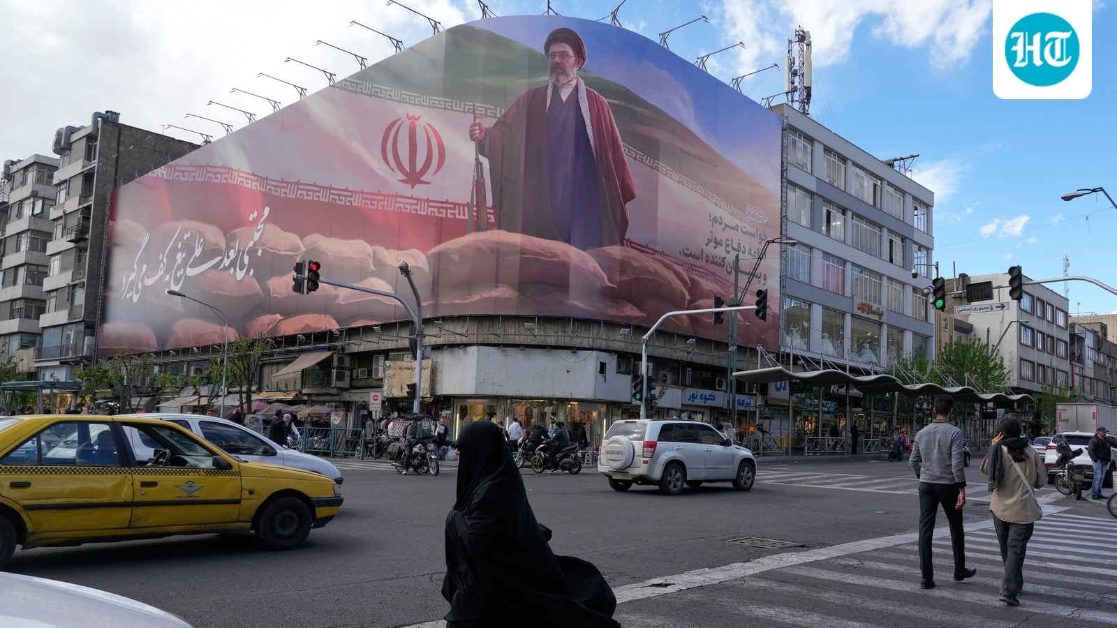 लोग एक बिलबोर्ड के पास से गुजरते हुए, जिस पर ईरान के तेहरान शहर में ईरान के सर्वोच्च नेता अयातुल्ला मोजतबा खामेनेई को चित्रित करने वाला एक ग्राफिक दिखाया गया है।