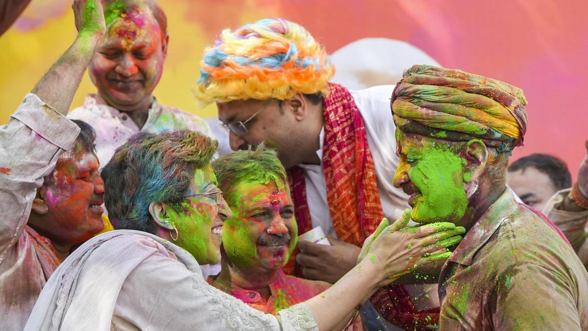 नई दिल्ली में आप प्रमुख अरविंद केजरीवाल पार्टी नेताओं आतिशी, मनीष सिसौदिया, संजय सिंह और अन्य के साथ होली मनाते हुए। | फोटो साभार: पीटीआई