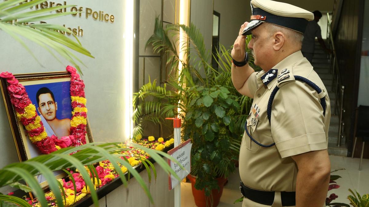 डीजीपी हरीश कुमार गुप्ता सोमवार को मंगलागिरी में एपी पुलिस मुख्यालय में अमरजीवी पोट्टी श्रीरामुलु को श्रद्धांजलि अर्पित करते हुए। | फोटो साभार: हैंडआउट