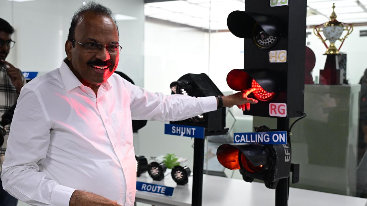 एफ्ट्रोनिक्स सिस्टम्स प्राइवेट के संस्थापक-सीईओ। लिमिटेड डी. रामा कृष्णा रविवार को मंगलागिरी में एक संवाददाता सम्मेलन में आधुनिक रेलवे सिग्नलिंग प्रणाली के बारे में बताते हुए। | फोटो साभार: जीएन राव