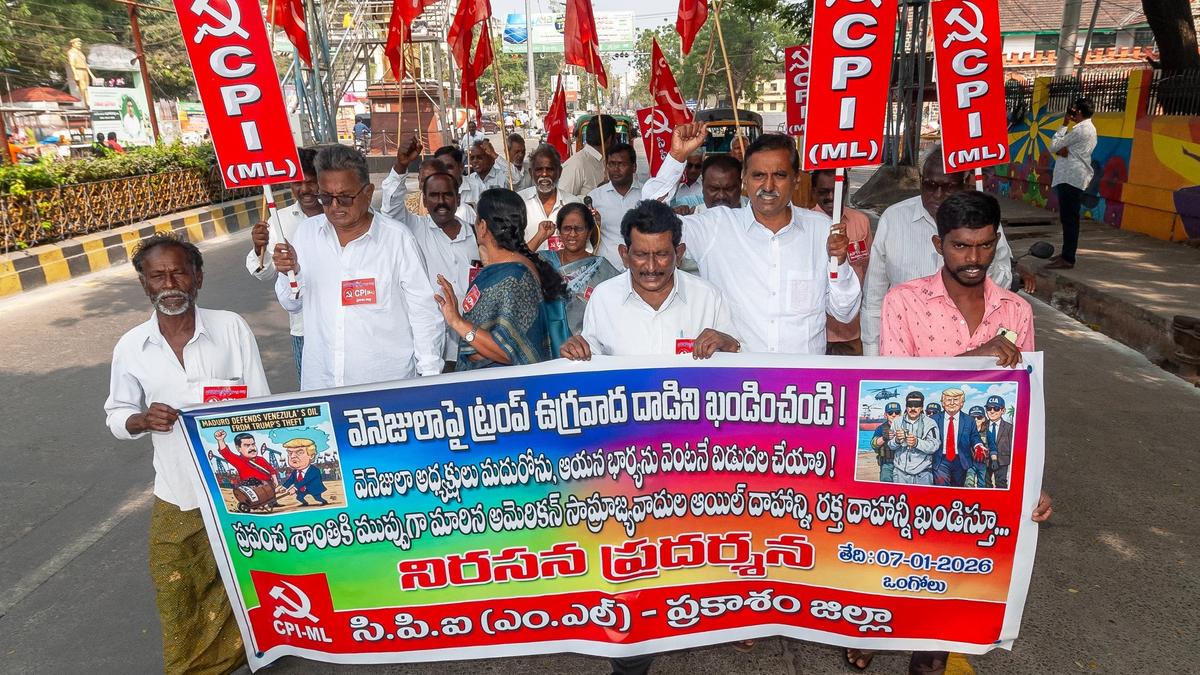 भारतीय कम्युनिस्ट पार्टी (मार्क्सवादी-लेनिनवादी) की प्रकाशम जिला समिति के सदस्यों ने बुधवार को ओंगोल में ट्रंक रोड पर वेनेजुएला पर राष्ट्रपति डोनाल्ड ट्रम्प के नेतृत्व वाली अमेरिकी सरकार के हमले की निंदा करते हुए विरोध प्रदर्शन किया।