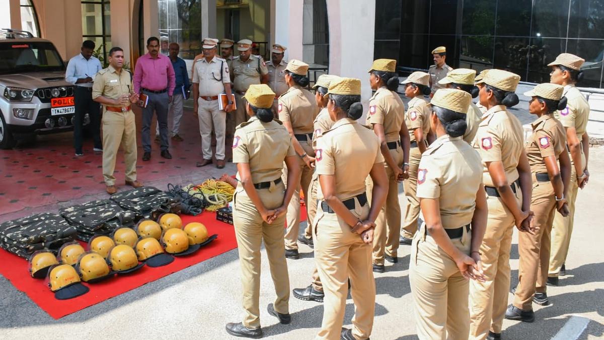 करूर के पुलिस अधीक्षक डीएन हरिकिरण शुक्रवार को करूर में महिला हड़ताली बल को निर्देश देते हुए। | फोटो साभार: विशेष व्यवस्था