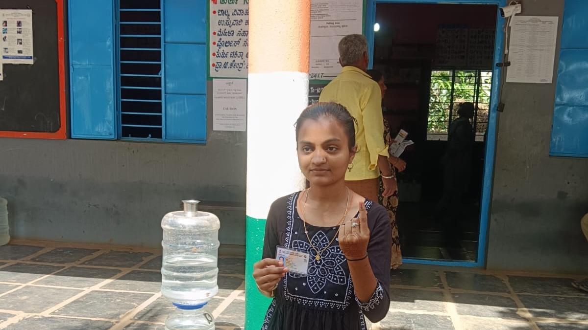 9 अप्रैल, 2026 को कर्नाटक के दावणगेरे दक्षिण विधानसभा क्षेत्र में उपचुनाव के दौरान हदादी गांव में अपना वोट डालने के बाद पहली बार मतदाता तेजस्विनी गर्व से अपनी स्याही लगी उंगली दिखाती हुई। फोटो साभार: विशेष व्यवस्था