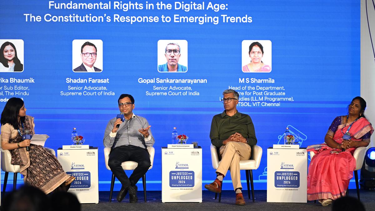 ‘डिजिटल युग में मौलिक अधिकार: उभरते रुझानों पर संविधान की प्रतिक्रिया’ विषय पर एक पैनल चर्चा में, गोपाल शंकरनारायणन, वरिष्ठ वकील, सुप्रीम कोर्ट; शादान फरासत, वरिष्ठ वकील, सुप्रीम कोर्ट; एमएस शर्मिला, कानून की प्रोफेसर, वीआईटी स्कूल ऑफ लॉ, वीआईटी चेन्नई, वरिष्ठ उप संपादक, आत्रिका भौमिक के साथ बातचीत कर रही थीं। द हिंदू.