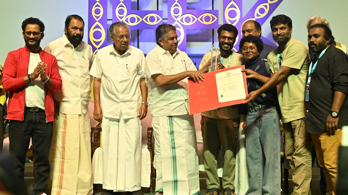 सांस्कृतिक मामलों के मंत्री साजी चेरियन ने शुक्रवार को तिरुवनंतपुरम के निशागांधी ऑडिटोरियम में महोत्सव के समापन समारोह के दौरान निर्देशक उन्नीकृष्णन अवला और उनकी टीम को फिल्म ‘थानथप्पेरु – लाइफ ऑफ ए फालुस’ के लिए आईएफएफके सर्वश्रेष्ठ फिल्म (दर्शक सर्वेक्षण) पुरस्कार प्रदान किया। मुख्यमंत्री पिनाराई विजयन, केरल राज्य चलचित्र अकादमी के अध्यक्ष रेसुल पुकुट्टी और सामान्य शिक्षा मंत्री वी. शिवनकुट्टी भी नजर आए। | फोटो साभार: निर्मल हरिंदरन