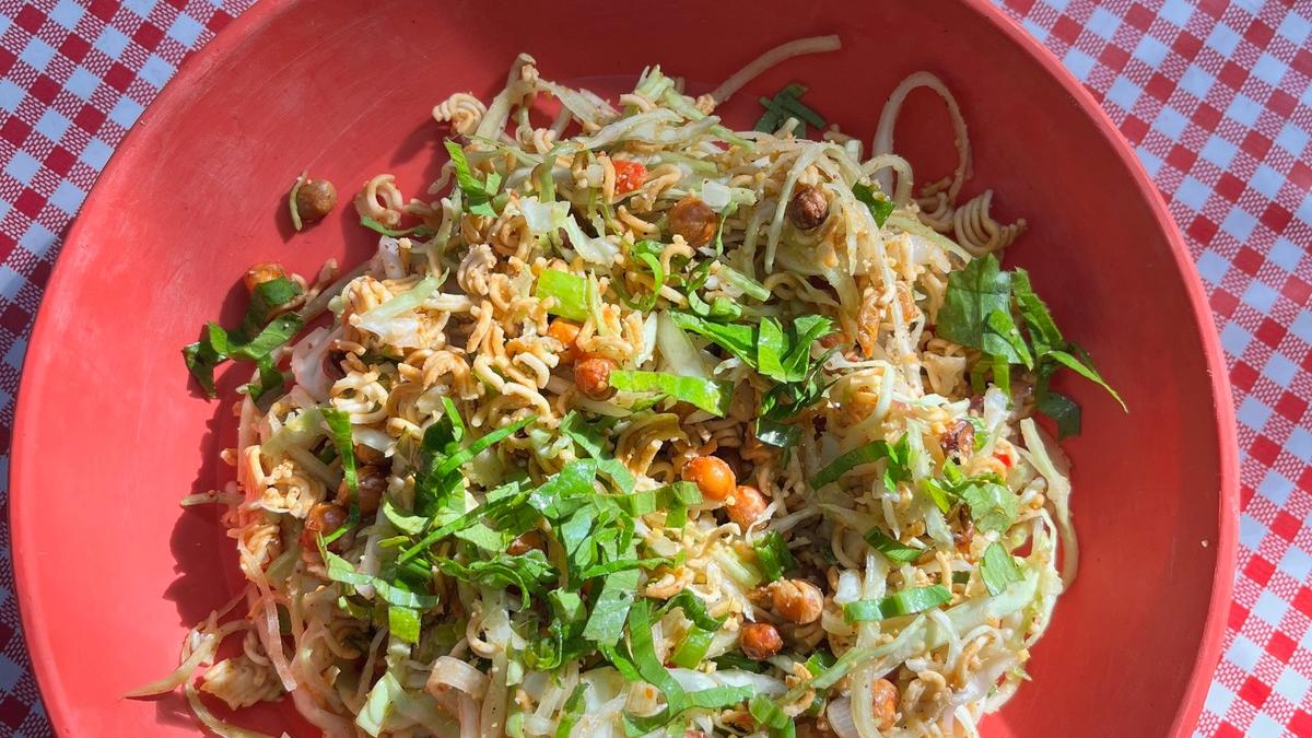 यह प्रस्तुति एक अप्रत्याशित लेकिन स्वागत योग्य अतिरिक्त के साथ आई: क्रंच के लिए कच्चे वाई वाई नूडल्स। मिश्रण को चमकाने के लिए एक त्वरित टॉस और नींबू निचोड़ने के बाद, कटोरा अधिक धनिया और मछली पुदीना के साथ समाप्त हो गया।