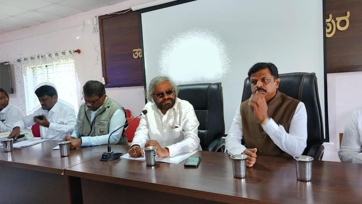 वन मंत्री ईश्वर खंड्रे रविवार को चिक्कमगलुरु जिले के तारिकेरे में अधिकारियों की बैठक ले रहे हैं। | फोटो साभार: विशेष व्यवस्था