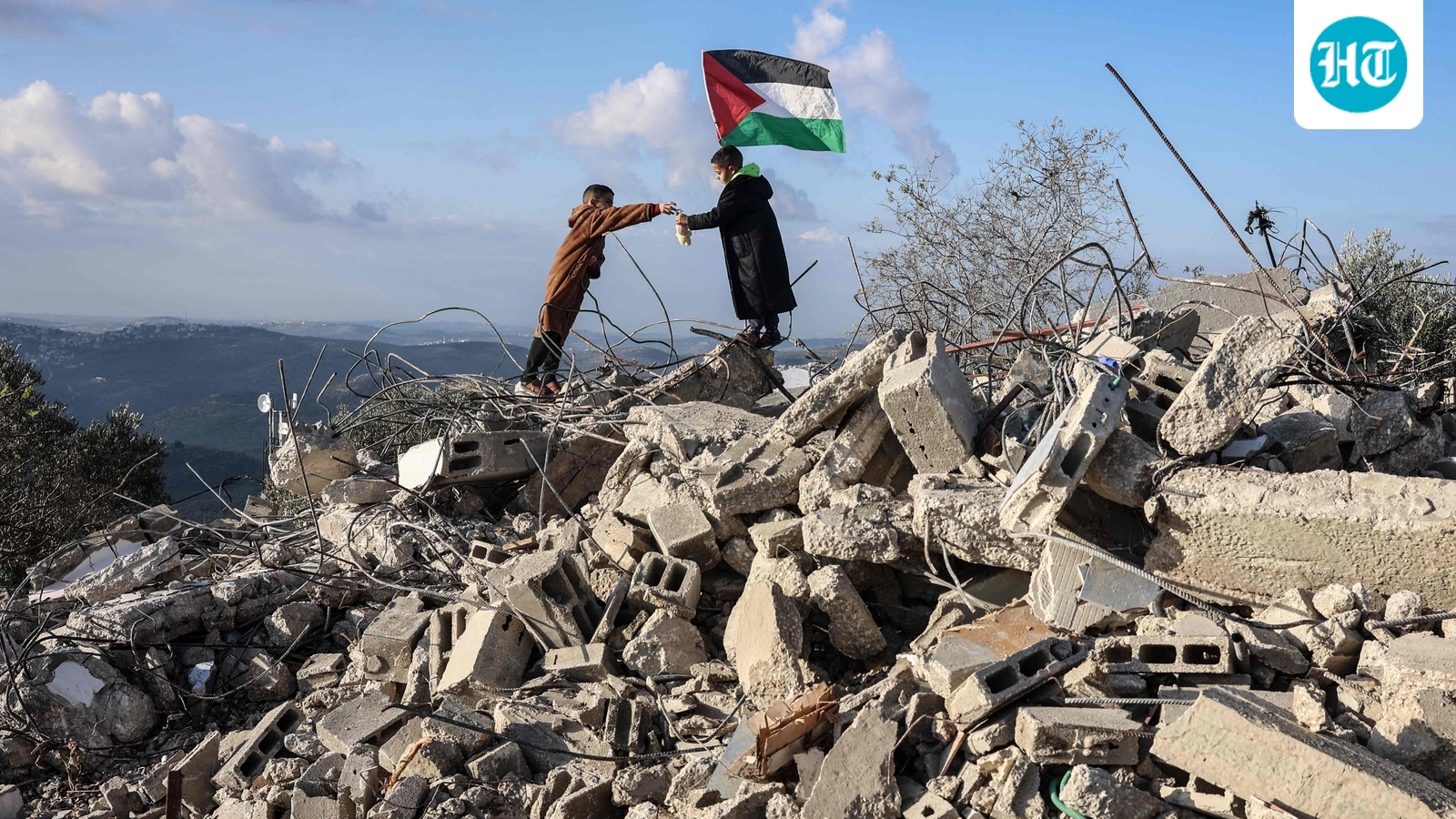 24 दिसंबर, 2025 को इजरायल के कब्जे वाले वेस्ट बैंक में फिलिस्तीनी गांव बिजारिया में इजरायली अधिकारियों द्वारा ध्वस्त किए गए एक घर के मलबे पर बच्चे अपने माता-पिता द्वारा ली गई तस्वीरें लेते हैं। (फोटो ज़ैन जाफर / एएफपी द्वारा)(एएफपी)