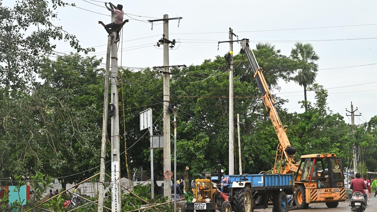 मछलीपट्टनम में बुधवार को बिजली विभाग के कर्मचारी क्षतिग्रस्त लाइनों की मरम्मत करते हुए। | फोटो साभार: केवीएस गिरी