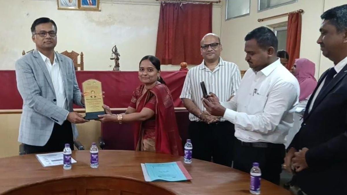 उच्च न्यायालय के न्यायाधीश आर. नटराज का रविवार को कलबुर्गी के एसएसएल लॉ कॉलेज में स्वागत किया गया। | फोटो साभार: विशेष व्यवस्था