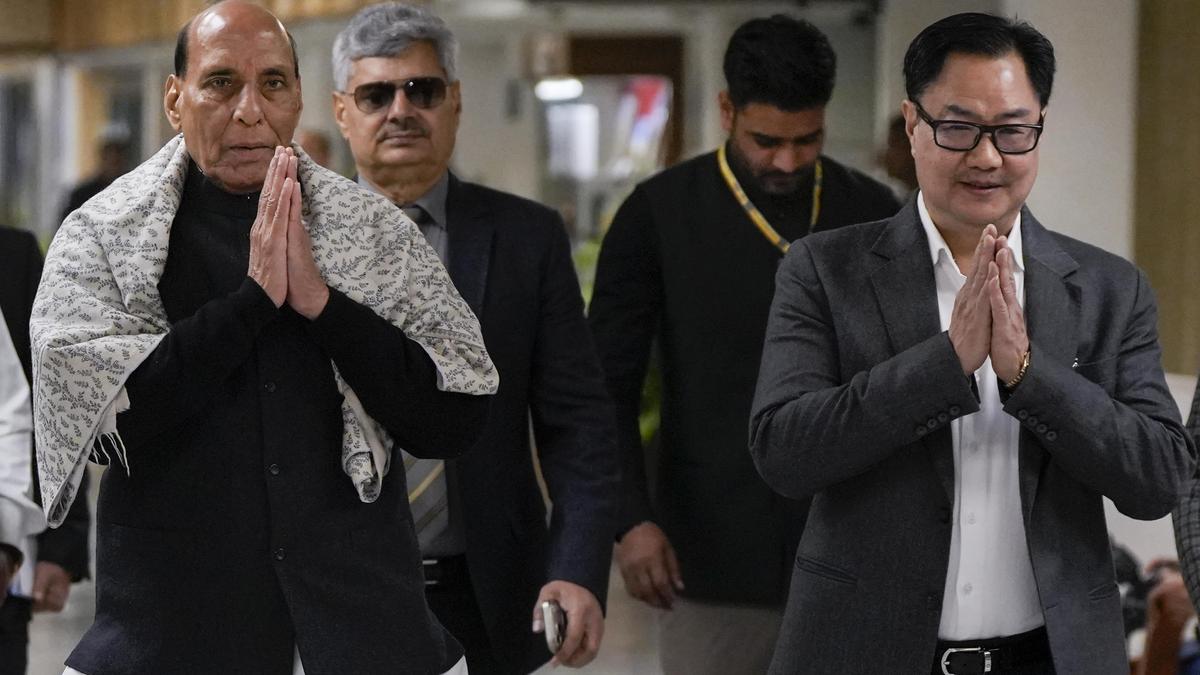रक्षा मंत्री राजनाथ सिंह, बाएं, केंद्रीय संसदीय कार्य मंत्री किरेन रिजिजू के साथ, 27 जनवरी, 2026 को नई दिल्ली में संसद के बजट सत्र से पहले सर्वदलीय बैठक के लिए पहुंचे। फोटो साभार: पीटीआई