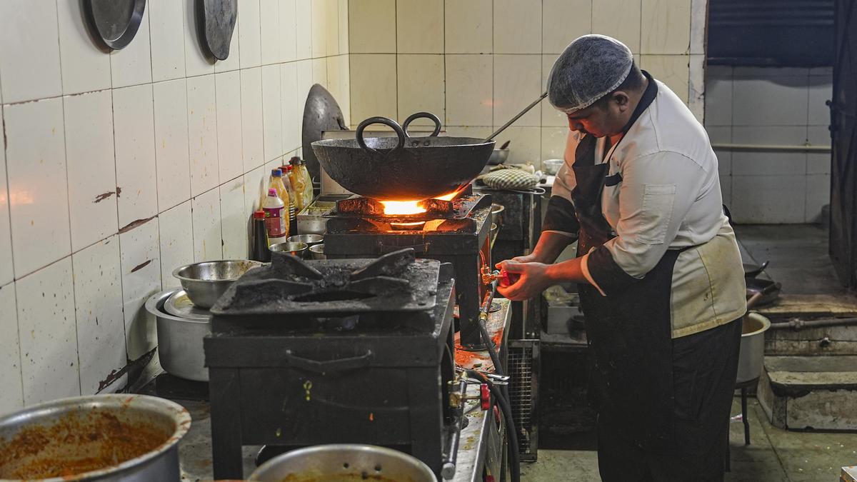 मुंबई के फोर्ट में वाणिज्यिक एलपीजी सिलेंडर की कमी के बीच एक रसोइया खाना तैयार करता है। फ़ाइल | फोटो साभार: पीटीआई