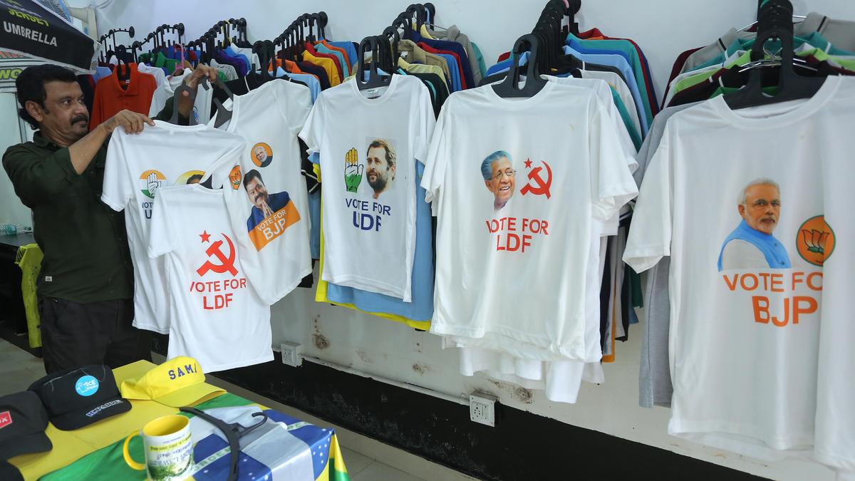 एर्नाकुलम में व्यापारी उन टी-शर्ट की मांग का फायदा उठा रहे हैं जिन पर उम्मीदवारों का चेहरा और चुनाव चिन्ह उभरा हुआ है। एर्नाकुलम उत्तर में एक व्यापारी। | फोटो साभार: आरके नितिन