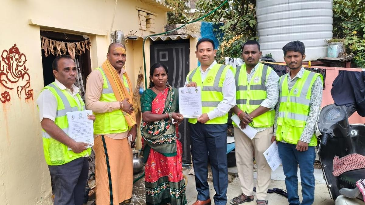 टीजीएसपीडीसीएल के अधिकारी रविवार को हैदराबाद में एक गृह ज्योति लाभार्थी को उपमुख्यमंत्री का संदेश सौंपते हुए। | फोटो साभार: व्यवस्था