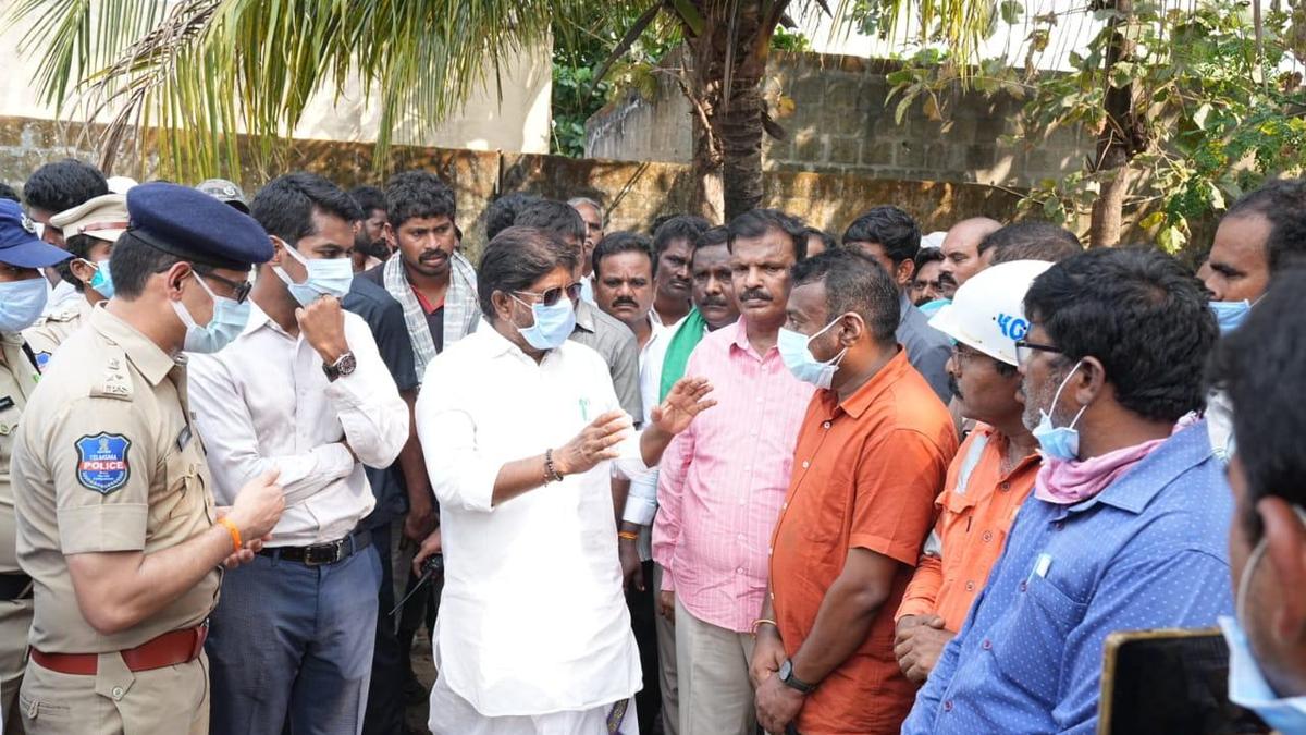 उपमुख्यमंत्री भट्टी विक्रमार्क रविवार को खम्मम जिले के अतकुरु गांव में एक कोल्ड स्टोरेज में आग लगने से नुकसान झेलने वाले किसानों से बात कर रहे थे। | फोटो साभार: विशेष व्यवस्था