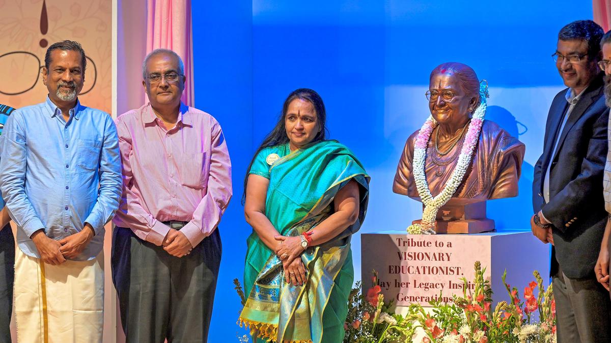 भारत सरकार के एमईआईटीवाई के सचिव एस कृष्णन ने बुधवार को चेन्नई में आयोजित शताब्दी समारोह के दौरान श्रीमती वाईजीपी की कांस्य प्रतिमा का अनावरण किया। | फोटो साभार: रघुनाथन एसआर