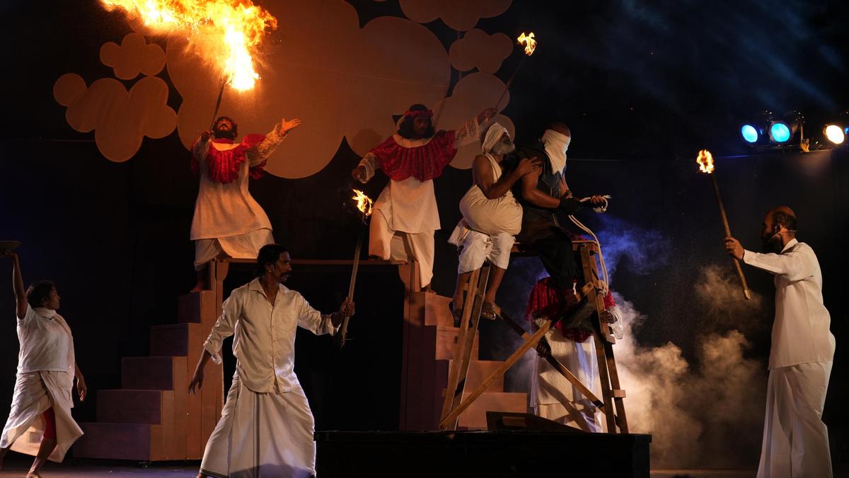 “केरल देश में प्रयोगात्मक थिएटर को बढ़ावा दे रहा है,” अलीयार नाटक के प्रदर्शन स्थान के बारे में कहते हैं, जो एक अखाड़े जैसा दिखता है या पूथराएक बहु-स्तरीय मंच, जिसके एक कोने में कलारीपयट्टू हथियार रखे गए हैं।