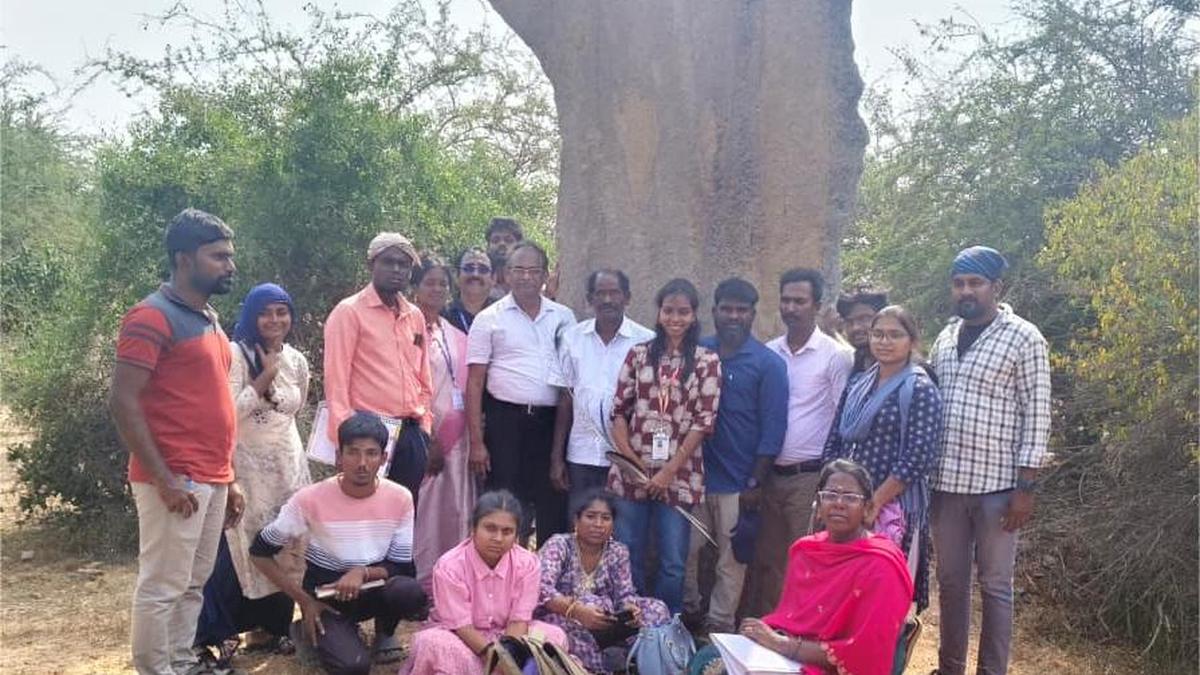 प्रोफेसर एस. रवि के नेतृत्व में तमिलनाडु केंद्रीय विश्वविद्यालय की टीम, तिरुनेलवेली जिले के सीवलापेरी में नायक पत्थर (पृष्ठभूमि में) के साथ। | फोटो साभार: विशेष व्यवस्था