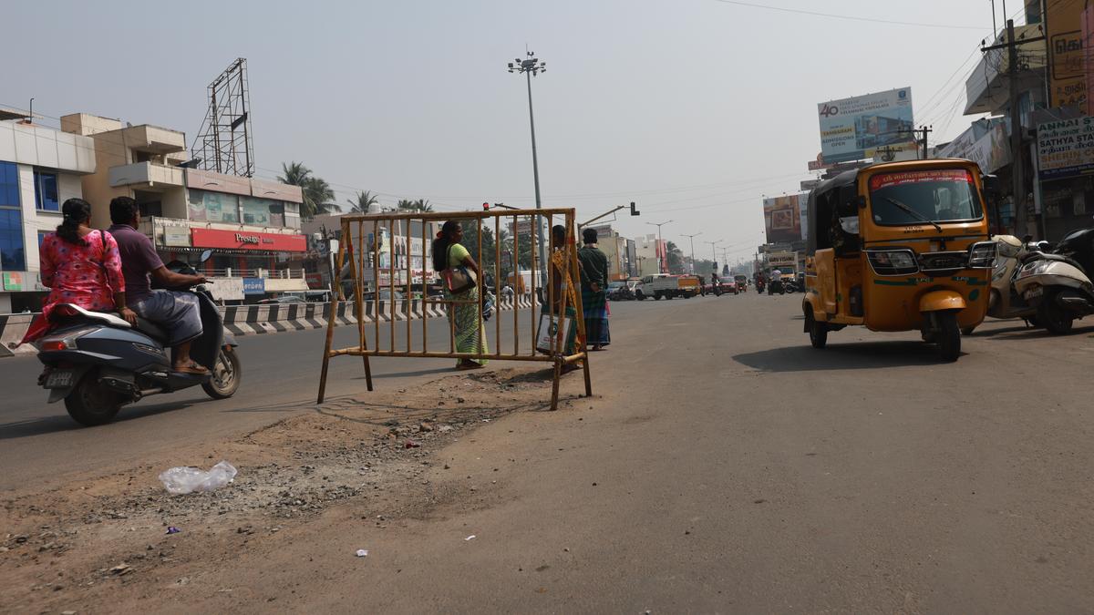तांबरम वेलाचेरी मेन रोड पर सेलाईतुर में कैंप रोड जंक्शन बस स्टॉप पर बैठने की कोई जगह नहीं है। छवि 1 फरवरी, 2026 को ली गई थी। | फोटो साभार: प्रिंस फ्रेडरिक