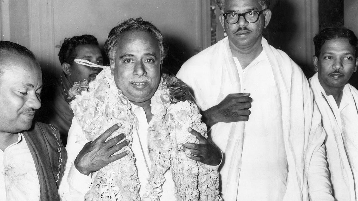 डीएमके विधानसभा नेता के रूप में चुने जाने के बाद, डॉ. एम. करुणानिधि अन्य मंत्रियों के साथ, 25 जनवरी, 1989 को अन्ना समाधि पर श्रद्धांजलि अर्पित करते हुए और पुष्पांजलि अर्पित करते हुए। फोटो साभार: द हिंदू