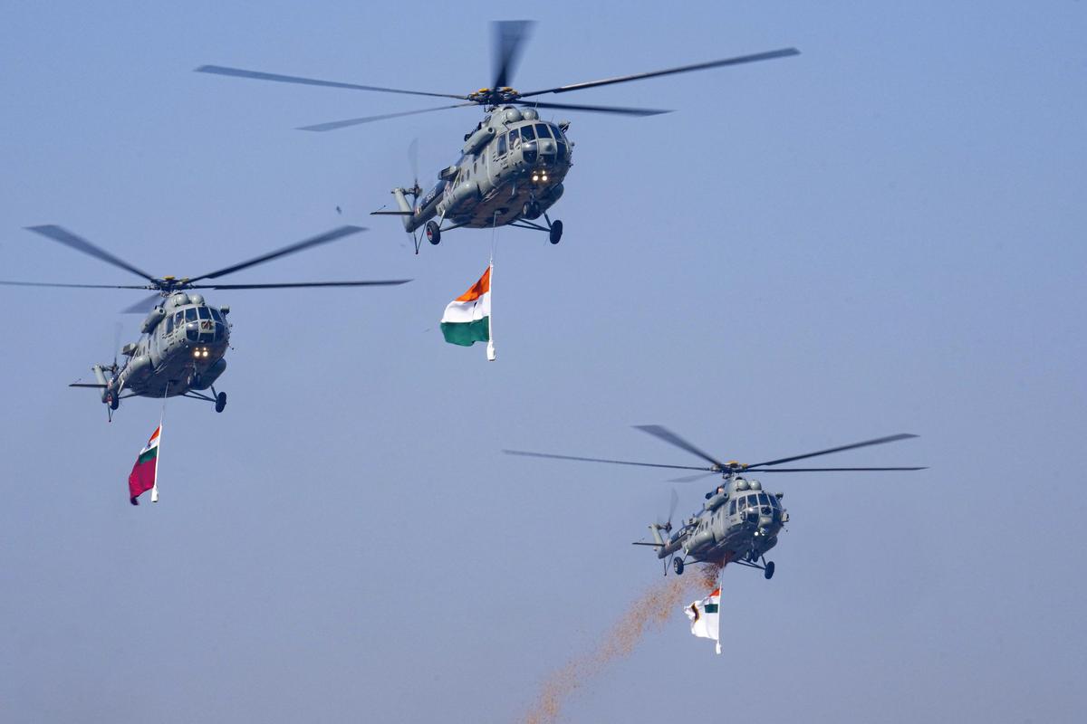 औपचारिक “ध्वज” गठन में, चार भारतीय वायु सेना एमआई -17 हेलीकॉप्टर सेना, नौसेना और वायु सेना के ध्वज के साथ राष्ट्रीय ध्वज फहराते हुए, कर्तव्य पथ पर उड़ान भरते हैं। फोटो: एपी