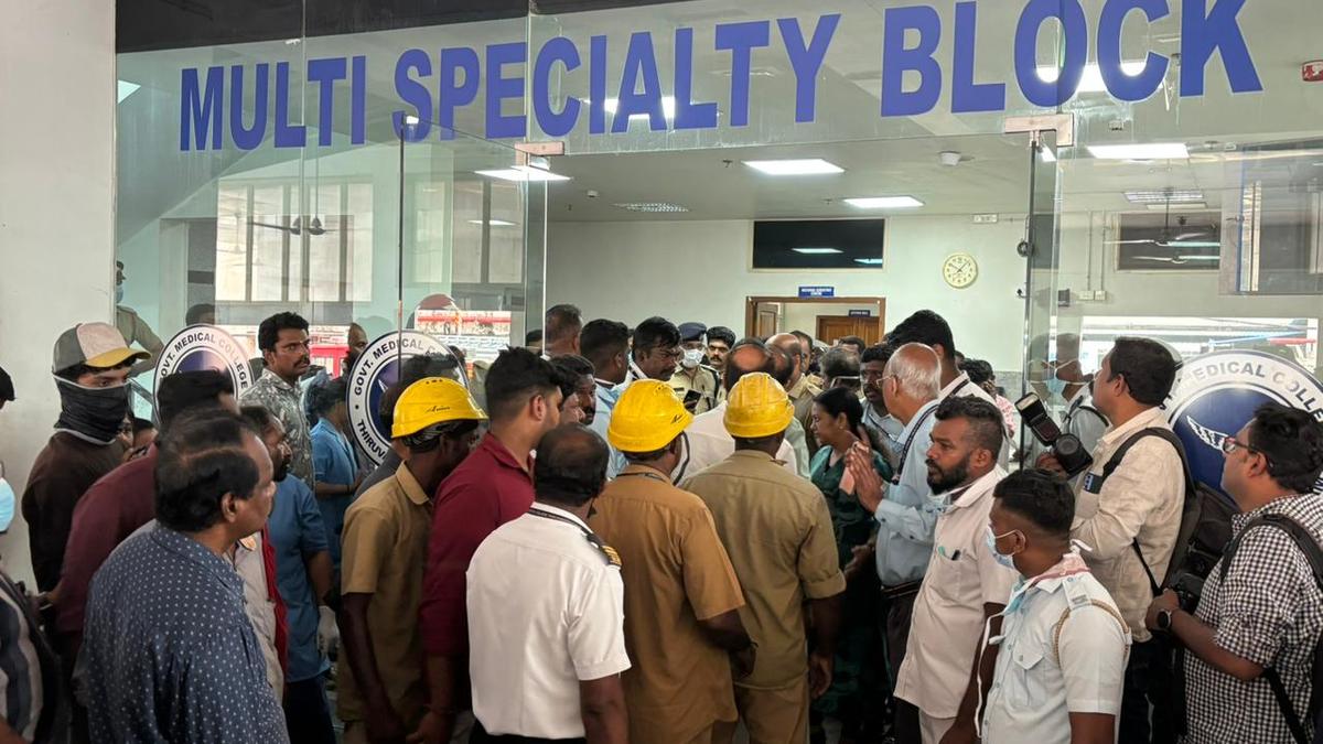 17 मार्च, 2026 को तिरुवनंतपुरम मेडिकल कॉलेज के मल्टी स्पेशलिटी ब्लॉक में आग लगने के बाद मरीजों को निकालने और कूलिंग ऑपरेशन जारी। फोटो साभार: निर्मल हरिंदरन