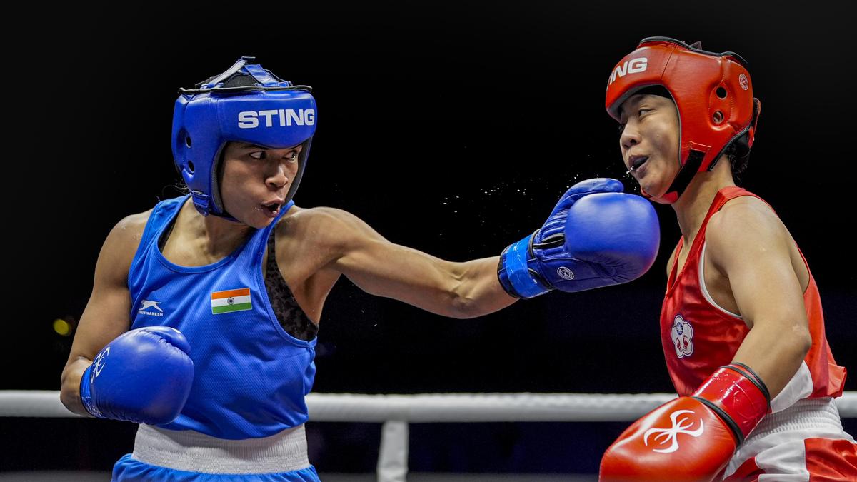 ग्रेटर नोएडा, उत्तर प्रदेश में गुरुवार (20 नवंबर, 2025) विश्व बॉक्सिंग कप फाइनल 2025 में महिलाओं के 51 किग्रा फाइनल मैच के दौरान चीनी ताइपे की गुओ यी-ज़ुआन के साथ नीले रंग में भारत की निकहत ज़रीन | फोटो साभार: पीटीआई