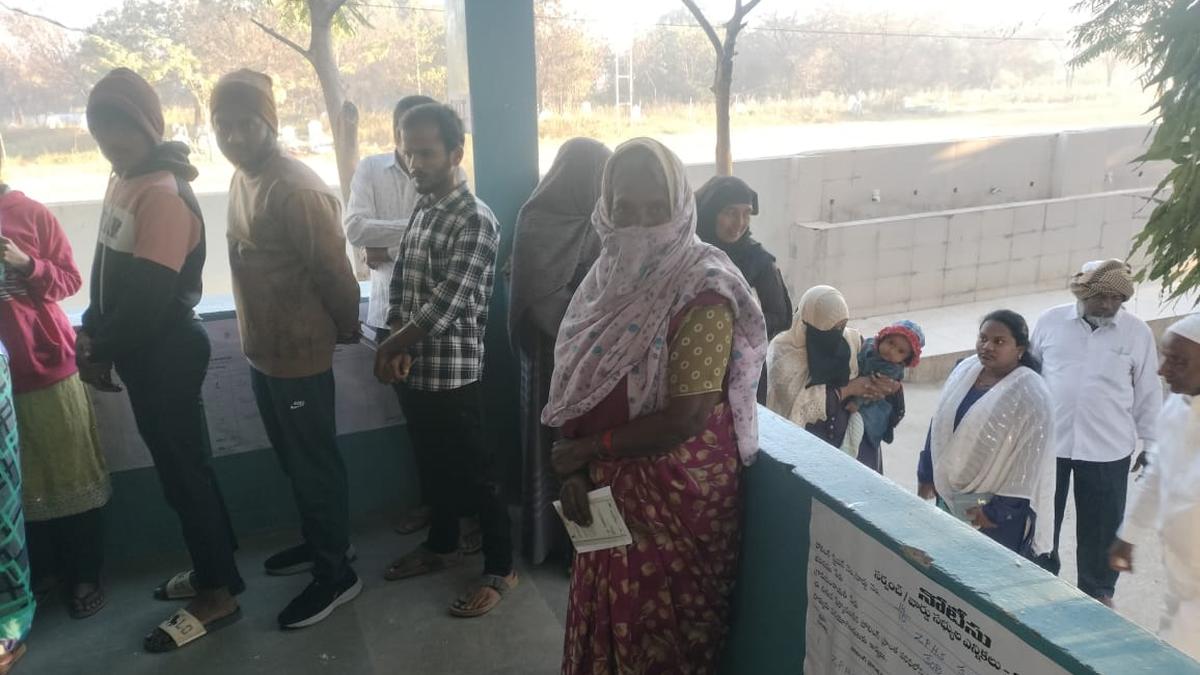 गुरुवार (11 दिसंबर, 2025) को संगारेड्डी में तेलंगाना ग्राम पंचायत चुनाव-2025 के पहले चरण में वोट डालने के लिए कतार में इंतजार कर रहे लोग। | फोटो साभार: व्यवस्था द्वारा