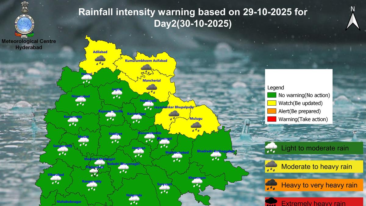 चक्रवात मोन्था के कमजोर होकर गहरे दबाव में बदलने और बुधवार (अक्टूबर 29, 2025) के अंत तक और कमजोर होकर दबाव में तब्दील होने की उम्मीद के साथ, भारत मौसम विज्ञान विभाग (आईएमडी) ने गुरुवार (30 अक्टूबर, 2025) के लिए पांच तेलंगाना जिलों के लिए भारी बारिश की चेतावनी जारी की है।