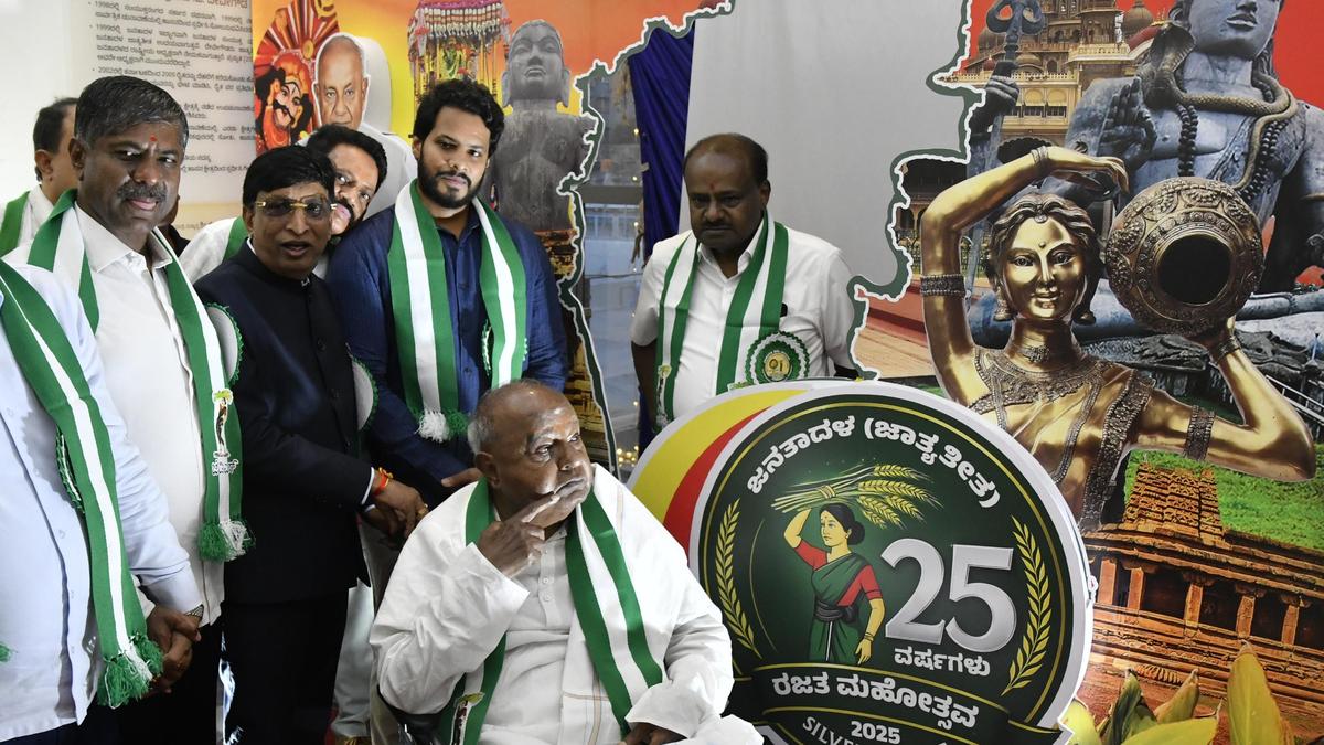 21 नवंबर, 2025 को बेंगलुरु में पार्टी के रजत जयंती समारोह में जद (एस) अध्यक्ष एचडी देवेगौड़ा और अन्य नेता। फ़ोटो साभार: एलन एजेन्यूज़ जे.