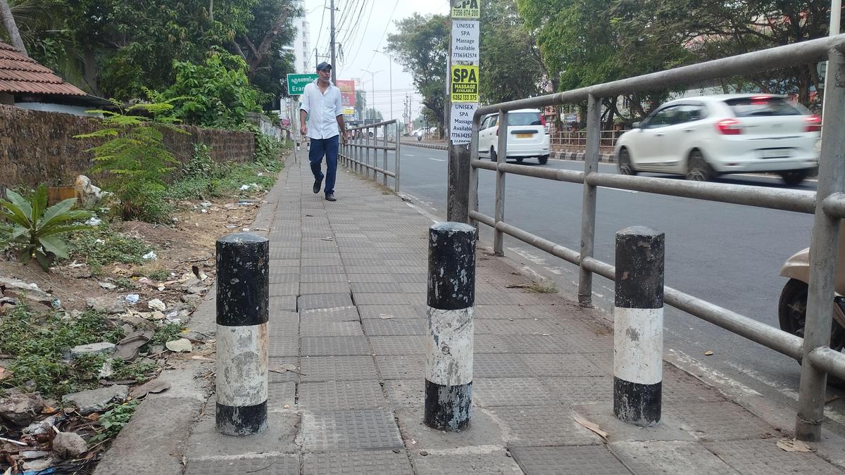 दोपहिया वाहनों के प्रवेश को रोकने के लिए हाल ही में कोझिकोड शहर में एरानिपालम के पास एक फुटपाथ पर बोलार्ड लगाए गए थे। | फोटो साभार: के. रागेश