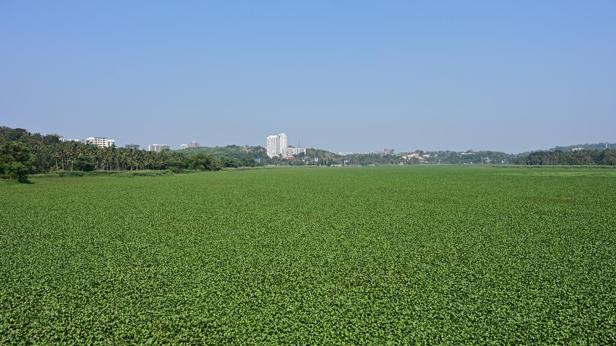 अक्कुलम झील जलकुंभी से ढकी हुई है। | फोटो साभार: विशेष व्यवस्था