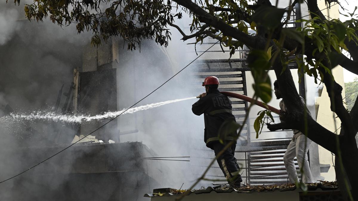 शनिवार को हैदराबाद के नामपल्ली में चिराग अली लेन में एक चार मंजिला इमारत के भूतल पर एक फर्नीचर की दुकान में लगी आग को बुझाने की कोशिश करते अग्निशमन कर्मी। | फोटो साभार: रामकृष्ण जी