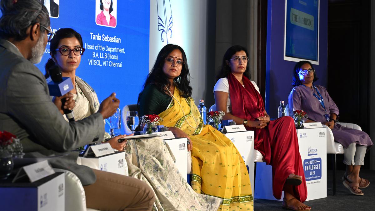 (बाएं से दाएं) कुणाल शंकर, डिप्टी बिजनेस एडिटर, द हिंदू, श्रेया अरोड़ा मेहता, जिला एवं अतिरिक्त सत्र न्यायाधीश, दिल्ली, संचिता ऐन, एडवोकेट ऑन रिकॉर्ड्स सुप्रीम कोर्ट, करुणा नंदी, सीनियर एडवोकेट सुप्रीम कोर्ट, तानिया सेबेस्टियन, एचओडी बीए एलएलबी (ऑनर्स) वीआईटी चेन्नई, 28 फरवरी, 2026 को नई दिल्ली में द हिंदू जस्टिस अनप्लग्ड 2026 में। फोटो साभार: आरवी मूर्ति