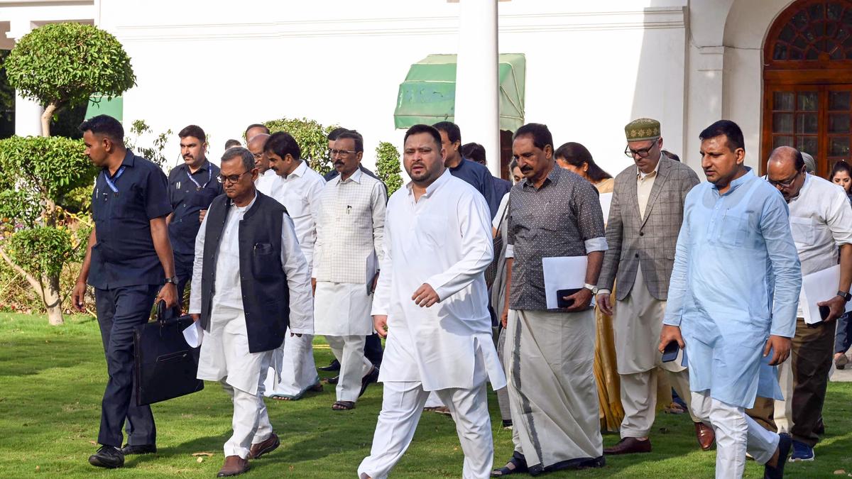 15 अप्रैल, 2026 को नई दिल्ली में इंडिया अलायंस की बैठक के बाद जम्मू-कश्मीर के मुख्यमंत्री उमर अब्दुल्ला, कांग्रेस महासचिव केसी वेणुगोपाल, एनसीपी-एसपी सांसद सुप्रिया सुले, राष्ट्रीय जनता दल (आरजेडी) के राष्ट्रीय कार्यकारी अध्यक्ष तेजस्वी यादव और अन्य | फोटो साभार: एएनआई