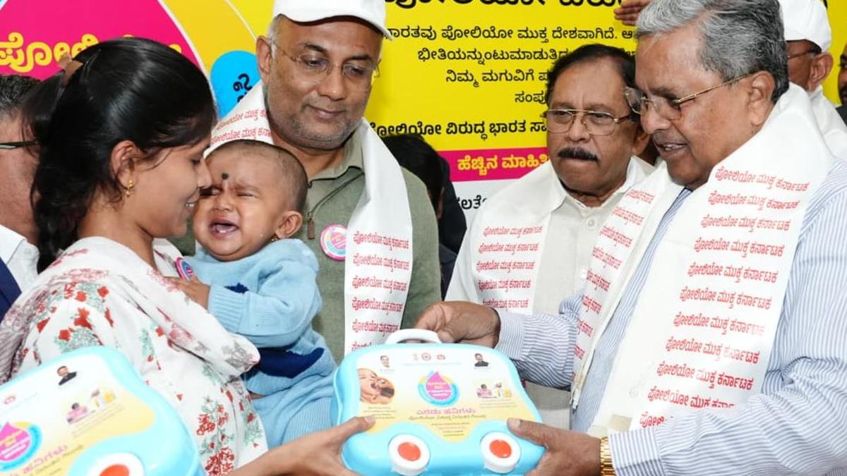 मुख्यमंत्री सिद्धारमैया, स्वास्थ्य मंत्री दिनेश गुंडू राव और गृह मंत्री जी. परमेश्वर के साथ, बेंगलुरु में पल्स पोलियो टीकाकरण कार्यक्रम के दौरान एक बच्चे को पोलियो ड्रॉप पिलाने के बाद एक किट सौंपते हुए। | फोटो साभार: विशेष व्यवस्था