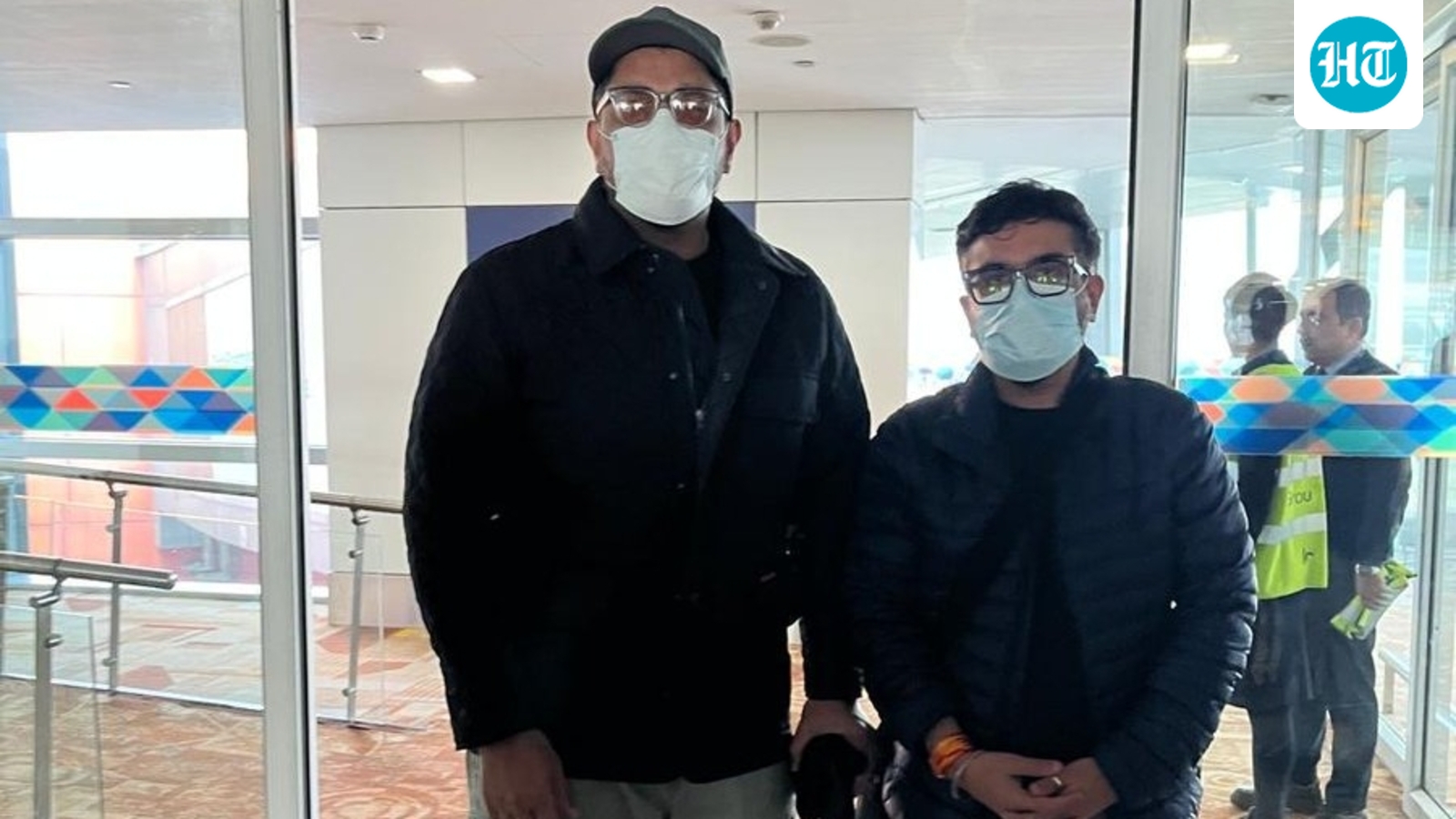 वे हवाई अड्डे के नियंत्रित, सुरक्षित वातावरण से घिरे हुए हैं, जिनकी पृष्ठभूमि में कांच के दरवाजे, सुरक्षा कर्मी और प्रतिबिंबित सतहें दिखाई देती हैं।