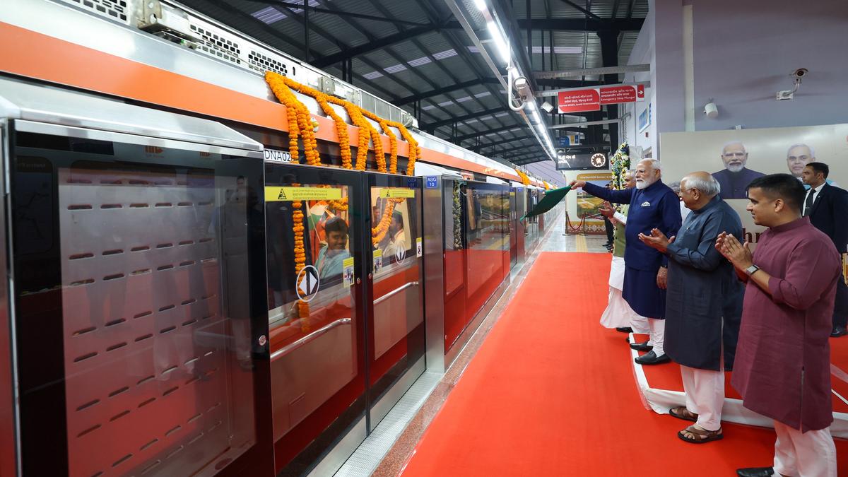 प्रधानमंत्री नरेंद्र मोदी रविवार को गांधीनगर के महात्मा मंदिर मेट्रो स्टेशन से मेट्रो रेल को हरी झंडी दिखा रहे हैं। | फोटो साभार: विशेष व्यवस्था