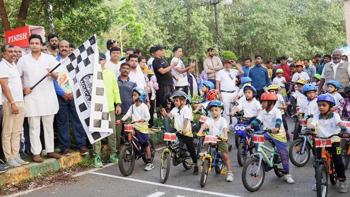 मैसूर के सांसद यदुवीर कृष्णदत्त चामराजा वाडियार ने रविवार (23 नवंबर) को मैसूर में बच्चों के साइक्लोथॉन को हरी झंडी दिखाई। | फोटो क्रेडिट: एमए श्रीराम