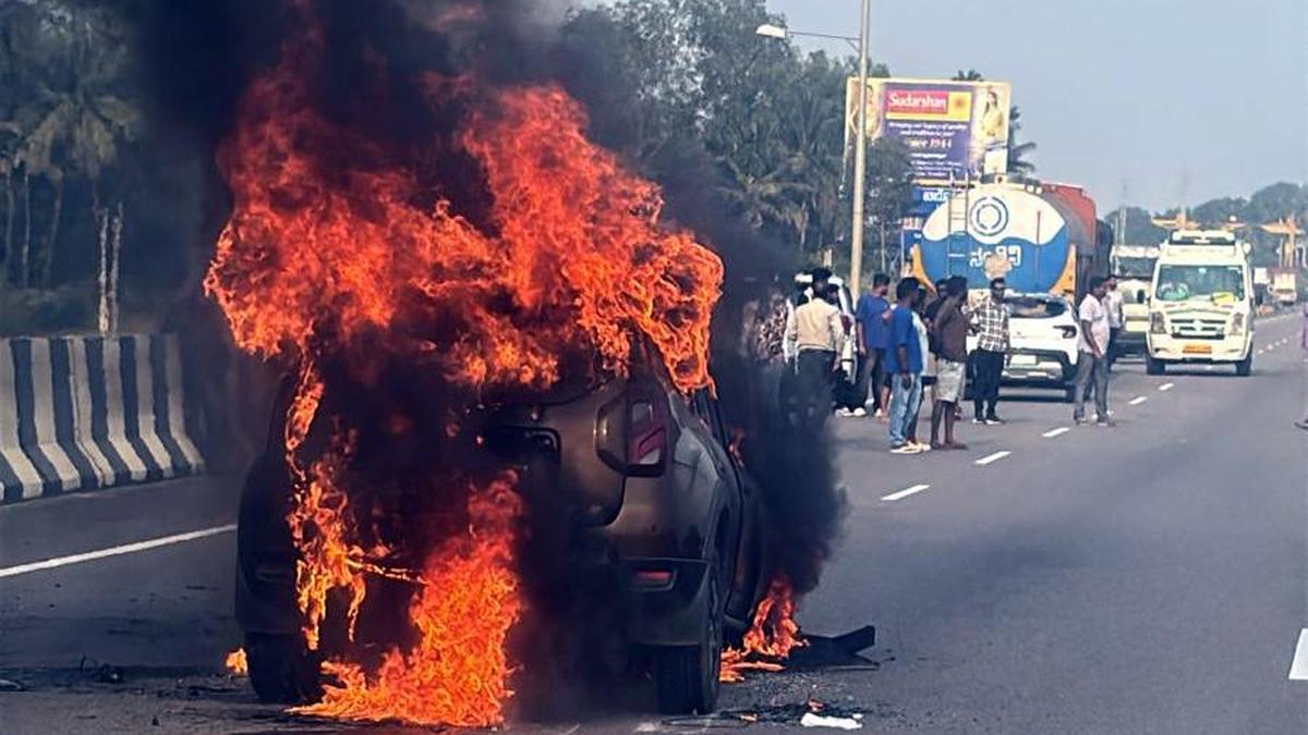 रविवार सुबह बेंगलुरु दक्षिण जिले के संगाबसावनदोड्डी के पास बेंगलुरु-मैसूरु पहुंच नियंत्रित राजमार्ग पर एक एसयूवी में आग लग गई। | फोटो साभार: विशेष व्यवस्था