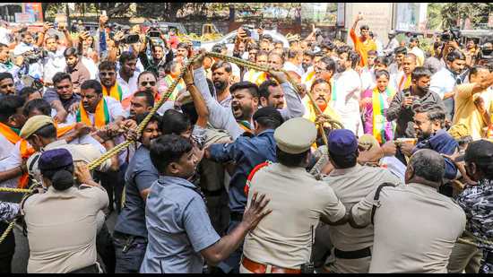 बीजेपी ने मंगलवार को हैदराबाद में बड़े पैमाने पर विरोध प्रदर्शन किया. पुलिस ने कहा कि पार्टी के वरिष्ठ नेताओं और बड़ी संख्या में कार्यकर्ताओं ने कथित तौर पर डीजीपी कार्यालय की घेराबंदी करने का प्रयास किया, विरोध प्रदर्शन के कारण स्थल पर कर्मियों की भारी तैनाती हुई और पार्टी कार्यकर्ताओं और पुलिस के बीच रुक-रुक कर झड़पें हुईं।