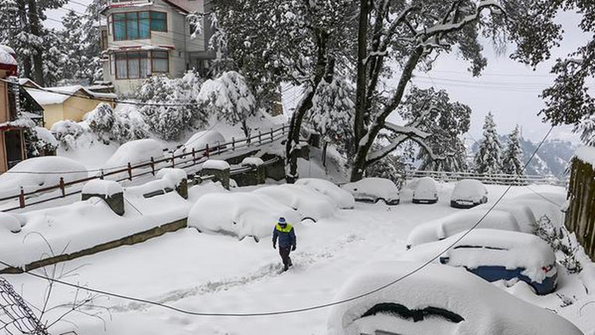 24 जनवरी, 2026 को शिमला में ताजा बर्फबारी के बाद बर्फ से ढके वाहनों के बीच से गुजरता एक आदमी। फोटो साभार: पीटीआई