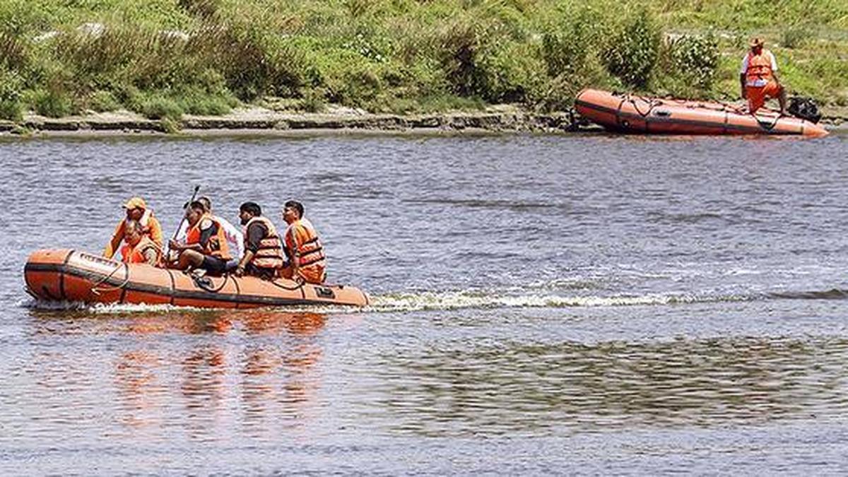 12 अप्रैल, 2026 को वृन्दावन, मथुरा में केशी घाट के पास यमुना नदी में नाव पलटने की घटना में बचाव अभियान जारी। फोटो साभार: पीटीआई