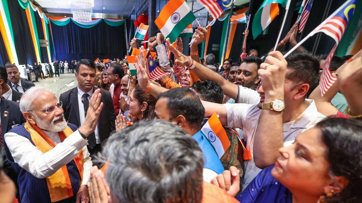 6 फरवरी, 2026 को कुआलालंपुर में भारतीय समुदाय के कार्यक्रम के दौरान प्रधान मंत्री नरेंद्र मोदी का भारतीय प्रवासियों द्वारा गर्मजोशी से स्वागत किया गया। फोटो क्रेडिट: एएनआई