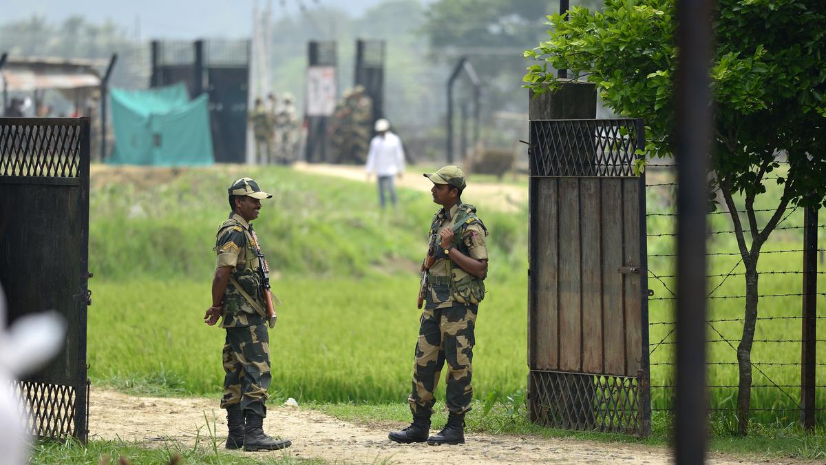 मेघालय के गारो हिल्स में भारत-बांग्लादेश सीमा पर बीएसएफ के जवान चौकसी बरत रहे हैं। फ़ाइल फ़ोटो केवल प्रतिनिधित्वात्मक उद्देश्यों के लिए। | फोटो क्रेडिट: रितु राज कोंवर