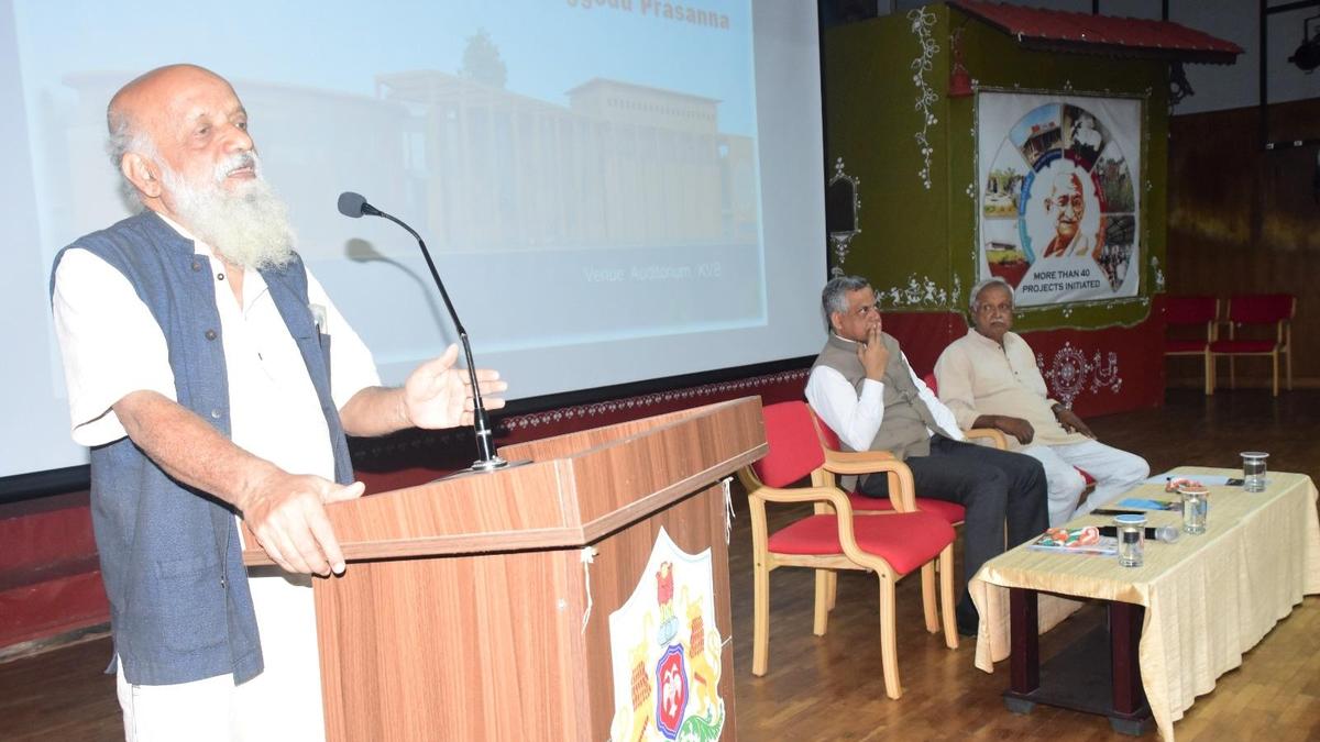 थिएटर व्यक्तित्व और खादी प्रमोटर हेग्गोडु प्रसन्ना बुधवार को गडग में महात्मा गांधी ग्रामीण विकास और पंचायत राज विश्वविद्यालय में गांधीवादी विचार पर एक विशेष व्याख्यान दे रहे थे। | फोटो साभार: विशेष व्यवस्था